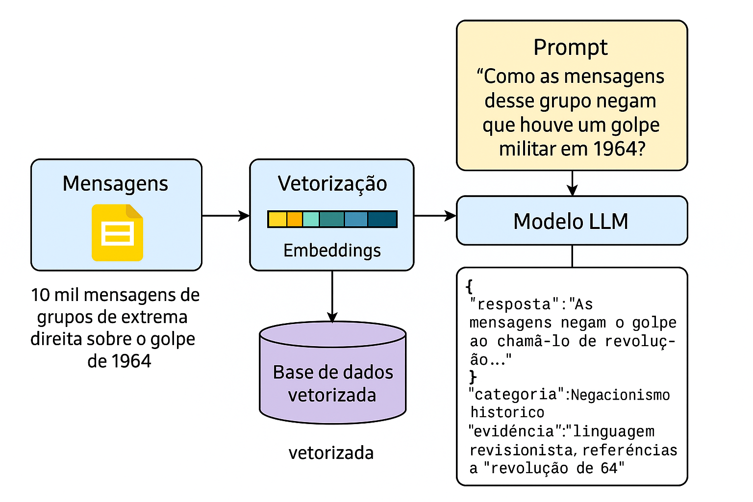 Diagrama ilustrando o fluxo de um sistema RAG para análise de mensagens sobre o golpe de 1964, com vetorizaçāo, consulta semântica e geração de resposta com base em dados reais.